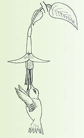 筒狀花中無氣味具大量花蜜且為鮮明紅色或橘紅色者,大多為鳥類傳粉的花類(圖11),特別是蜂鳥眼睛對亮紅色系敏感度較高,但並不靠氣味找尋花朵,且其吸蜜時,振翅頻率非常高,耗能也多,每次花間拜訪若無大量的花蜜收穫,實在是徒勞無功,損失慘重;因此共同演化的結果,蜂鳥傳粉的花均產大量花蜜且具亮紅色系筒狀花,而蜂鳥以其快速飛行的習性為花傳粉(圖12)。