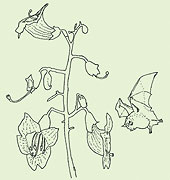 還有以蝙蝠傳粉的花朵,也因適應蝙蝠晝伏夜出的習性,特別選在夜晚開花(圖13)。由於蝙蝠視覺較差,嗅覺及其他覺察力特強,此類花朵多為在夜間目標較顯著的白色,具有大量花蜜,且散發麝香氣味導引蝙蝠的拜訪;為了防止蝙蝠衝撞時造成斷蕊折花,無法受精結果傳宗接代,此類花構造及花柄都較大而粗壯能承擔蠻橫的衝擊(圖14)。