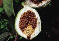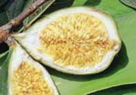 愛玉的盛產期為每年農曆10月~12月,成熟時形似青芒果(圖7),摘下後,削去青皮,再將果實縱割一刀,要深及核果,置曬棚架上曝曬一天,直到變軟;再將其果實沿著縫輕輕向外翻,翻皮後,再繼續曝曬3到6日,其曝曬時須核果朝下,凹皮朝上,直至核果基部充分乾燥,期間不可受雨水、露水浸潤,待乾燥後,收好密封即是市面上販售的愛玉子(圖8),而購買者再加工製成愛玉凍。