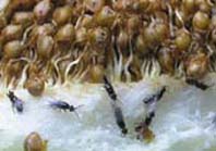 以愛玉和薜(ㄅㄧˋ)荔為例,雄榕果發育至雄花期時,子房內的雄小蜂先羽化出來,用發達的大顎咬破蟲癭花再與雌小蜂交尾後死亡,接著雄花盛開釋出花粉,身懷六甲的雌小蜂離開蟲癭並帶著雄花之花粉離開雄榕果(圖6)。一部分的雌小蜂進入雌花期的愛玉雄榕果,在蟲癭花的子房進行產卵的工作。而另一部分的雌小蜂則進入雌花期的雌愛玉果,由於雌愛玉果內都是長花柱雌花,不適於薜荔小蜂產卵,因此薜荔小蜂就在榕果內爬來爬去,因它身上帶著花粉,於是就幫雌愛玉果完成授粉的工作。由於每個愛玉果內約有1~2萬朵的雌花(很難想像吧!),因此每個愛玉果需有許多隻的薜荔小蜂來協助授粉,若薜荔小蜂的數量不夠或所帶的花粉太少,則所長成的愛玉果品質就不好,因為只有發育良好的小核果才含有果膠,也才能洗出愛玉凍。薜荔小蜂自雄榕果的雄花期飛出時,到底要飛到雄榕果呢?(牠要孕育下一代),還是要飛到雌榕果呢?(植物需薜荔小蜂來幫助傳粉),原來植物(雌株)會分泌化學物質,並且雌榕果、雄榕果長得很像,以吸引薜荔小蜂進入雌榕果傳粉,否則,若小蜂只到雄榕果產卵,植物不是白白浪費資源養育牠們了嗎?