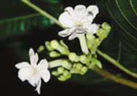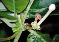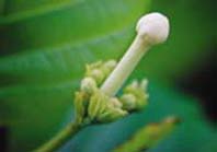 茜草科葛塔德木屬(Guettarda L.)的葛塔德木(G. speciosa L.),是一常綠性的小型或中型喬木。葉片呈廣橢圓形、橢圓形或倒卵形,約14~21公分長,10.6~16.0公分寬,葉的先端銳形或圓形,基部則是心臟形,側脈一般是8~10對,非常明顯(圖2);葉子摸起來是屬於厚紙質,上面無毛而下表面則是密密的白毛;葉柄長短不一,約1.5~6公分長;托葉淺綠色,卵形或闊三角形(圖3)。聚繖花序雖然由葉腋長出,但多數集中在枝條頂端(圖4);總花梗約1.8~8.0公分長,密被有白色毛茸。花白色近無梗,約2.5~3.0公分長(圖5);花萼短筒狀,裂片截形(圖6);花瓣筒狀,具有6~8枚裂片,在花苞時期裂片是呈覆瓦狀排列(圖7),外面被柔毛,內面除了喉部具有短柔毛外,其餘則光滑;雄蕊6~8枚,花藥線形,花絲很短但伸入花瓣中;子房4~6室,外面被白柔毛。比較特別的是,葛塔德木的花有兩種型態,外表的差別不大,但是花柱的長短和雄蕊與柱頭的相對位置卻有不同:那些比較偏雄性的花,其花柱短而花藥位在柱頭之上;趨向結果的花(雌性花),則花柱延長甚至伸出花冠外,而花藥自然是位於柱頭之下方嘍(圖8)!葛塔德木的果實是核果,多數呈球形,有時略扁一些,直徑約在1.3至2.5公分之間,顏色則是由剛結果時的灰綠色轉為成熟的褐色。種子下垂,細長圓形,一般僅4~6枚。