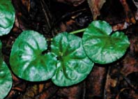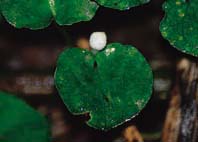 D. Don)。多為闊心臟形或圓形的葉子,呈墨綠色(圖2),一般長度較寬度為小,約2.0~2.6公分長,2.7~3.3公分寬,摸起來是紙質且上表面光滑無毛,葉背面則被有稀疏的毛茸;被茸毛的葉柄長短變化很大,從1.2公分到11.0公分都有,而托葉則呈全緣的廣三角形。單朵白色的花多數是由匍匐枝條頂端長出;而花苞非常的小,其裂片呈瓣狀排列(圖3)。被茸毛的花梗約有1.2~