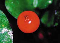 6公釐長,柱頭2裂,均不伸出花冠外(圖5),子房2室且每室僅有一粒胚珠。多汁肉質的核果圓球形,直徑約 0.7~12公分長,成熟時呈亮麗的鮮紅色(圖6);果實內僅有2枚黃褐色的種子。 在蘭嶼島上的達悟(雅美)人很能充分利用大自然的寶藏,他們能依照植物各部位的特性,來發揮、組合成他們所要的器物,這也就是為何一艘十人座的蘭嶼「拼板舟」,會需要用到二十多種植物的各個部位來組成。然而「草本植物」在達悟人的眼中,多數是「女人」才要使用的,「大丈夫」不為也!所以到目前為止,苞花蔓可能只有鳥類、昆蟲會去食用,或像研究植物區系的人會去採集,蘭嶼當地人可還不會去碰它們的。在您到蘭嶼度假時,不用花很大的力氣就可以發現它們了,所以也請找找看吧! |
